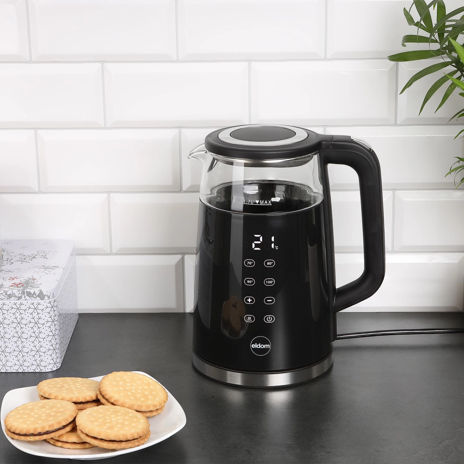 Den intuitive touchbetjening med LED-display giver hurtig adgang til 4 presets (70/80/90/100 °C) og til Keep Warm-funktionen i op til 2 timer. Den 360° roterende base gør håndteringen nem i alle retninger, og automatisk slukning med tredobbelt beskyttelse sikrer sikker drift.