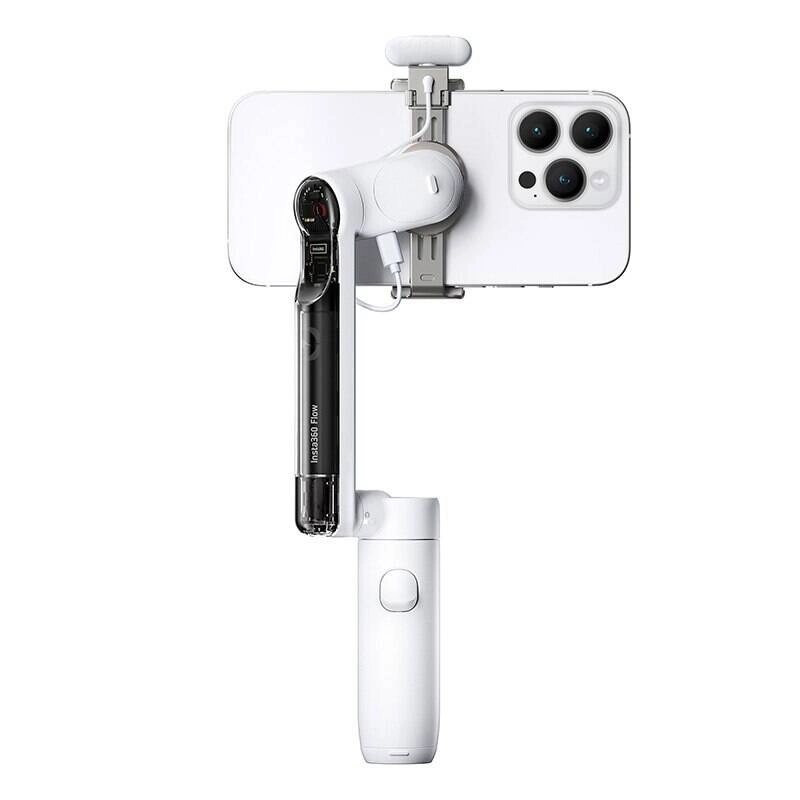 Betjeningen er hurtig og intuitiv: SmartWheel giver adgang til gimbaltilstande, afspilning og optagelse, der er gestusstyring og tilstande som Auto, FPV, Panorama, Dolly Zoom, TimeShift og Motion Timelapse. På iPhone genkendes Flow automatisk af Insta360‑appen, så du er i gang på få sekunder.
