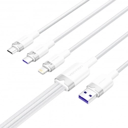 Vention 3-i-1-kablet kombinerer USB-C, Lightning og Micro-B-stik, så du nemt kan oplade telefoner, tablets og småelektronik. Den integrerede chip fordeler strømmen intelligent mellem tilsluttede enheder og beskytter batterier mod overopladning og overophedning.