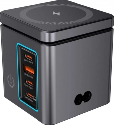 Den kraftige BlitzWolf vægoplader med GaN-teknologi leverer op til 105 W til samtidig strømforsyning af op til 6 enheder. Den har 3× USB‑C, USB‑A og to trådløse zoner (telefon 15 W, høretelefoner 5 W). Understøtter hurtigopladning PD/QC, er ideel til laptops, telefoner, tablets samt Apple Watch og har LED‑indikator for status.