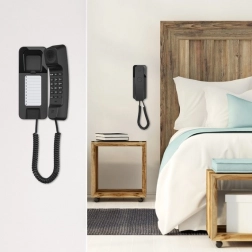 Det slanke kabinet sparer plads og muliggør hurtig vægmontage samt komfortabel brug på bordet. Ideel til gange, receptioner og ved sengekanten.