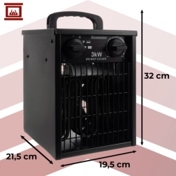 Den elektriske varmeenhed fra KAMINER med en effekt på 3000 W er ideel til hjem, kontor, værksted og byggeplads. Takket være en kraftig luftgennemstrømning på 514 m³/t opnås den ønskede temperatur hurtigt og holdes stabil ved hjælp af en selvresetter termostat. Beskyttelsesklasse IPX4 sikrer sikker brug selv i mere fugtige miljøer.