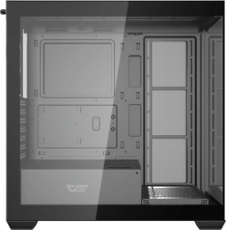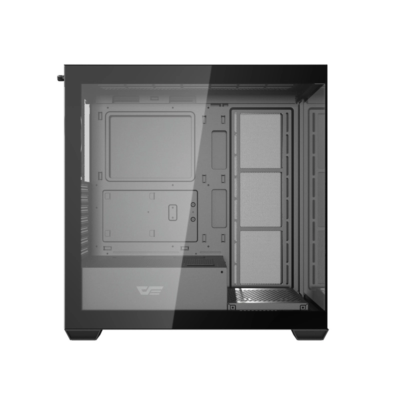 Darkflash DS900W kombinerer minimalistisk design med funktionalitet. Dobbeltsidet hærdet glas giver en 270° panoramisk visning af komponenterne, og fraværet af A-søjle understreger det rene look. Den robuste mekaniske konstruktion sikrer høj stabilitet selv til tunge grafikkort og kraftig køling.