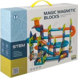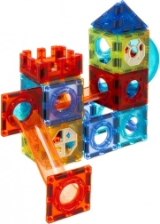 Magnetiske klodser og baneelementer af holdbar ABS-plast fæstner sig let og stabilt takket være stærke magneter. Børn kan bygge flade og rumlige konstruktioner, tårne, broer og især kreative kuglebaner med tunneller, sving og skåle. Gennemsigtige farver understøtter sansning af former og farver og indbyder til at udforske.