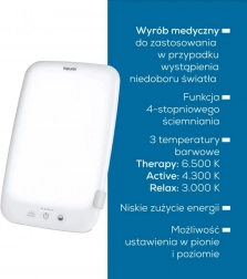Med 3 valgbare lysfarver tilpasser du nemt belysningen til din daglige rytme: Active (4300 K) til fokuseret arbejde om formiddagen, Therapy (6500 K) til lysterapisessioner midt på dagen med intensitet 10.000 lx og Relax (3000 K) til afslapning om aftenen. Berøringsbetjening, 4-trins dæmper og behandlings-timer i 4 trin sikrer komfortabel brug.