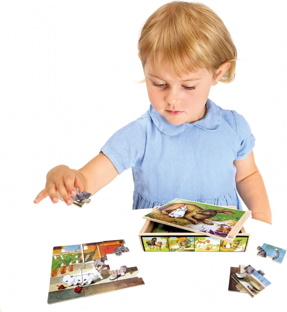 Oplev magien ved traditionelle træpuslespil, som præsenterer motiver som katte, hunde, heste og kaniner. Sættet indeholder 48 brikker, der er pakket i en praktisk kasse med låg, hvilket gør dem nemme at opbevare og transportere.