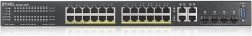 - 24× GbE PoE (10/100/1000 Mb/s), SFP combo-uplinks (afhængigt af model)