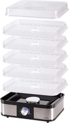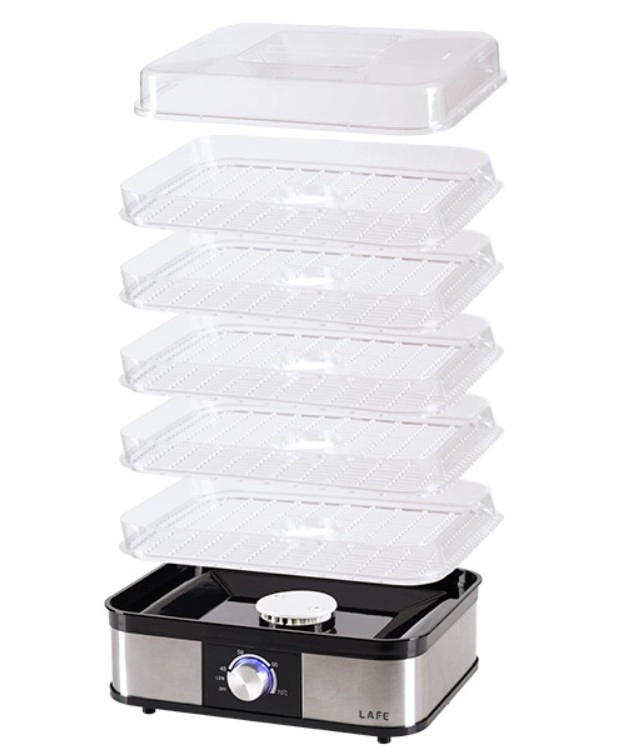 De gennemsigtige niveauer gør det nemt at overvåge processen, mens 5 rummelige bakker lader dig tørre større mængder ad gangen. Skal du spare plads, kan nogle bakker nemt tages ud. Den integrerede blæser og de perforerede bakker fremmer cirkulationen, modvirker skimmel og forkorter tørretiden.