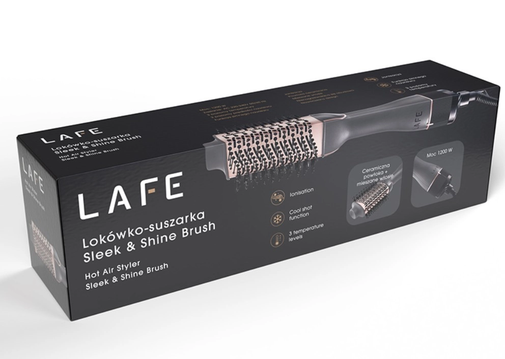Varmluftsbørsten LAFE Sleek & Shine Brush kombinerer funktionerne fra hårtørrer og rundbørste for hurtig frisurestyling i ét strøg. Ionisering mindsker statisk elektricitet og tæmmer flyvsk hår, så det forbliver glat, skinnende og medgørligt.