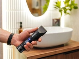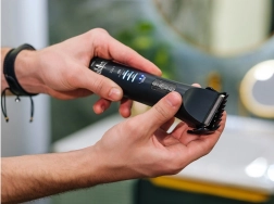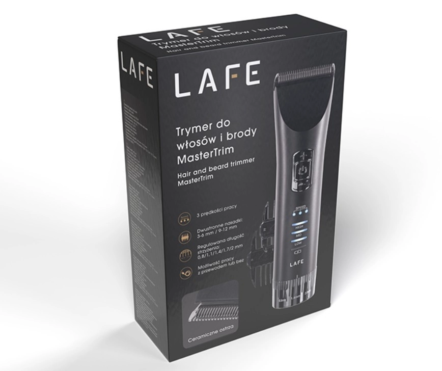 Leder du efter en pålidelig trimmer til præcis styling af hår og skæg? MasterTrim tilbyder skarpe keramiske blade på 45 mm for en glat klipning, tre effektniveauer til forskellige hår- og skægtyper samt præcis længdeindstilling 0,8 / 1,1 / 1,4 / 1,7 / 2,0 mm. Takket være den ergonomiske form og trådløs drift har du fuld kontrol over stylingen.