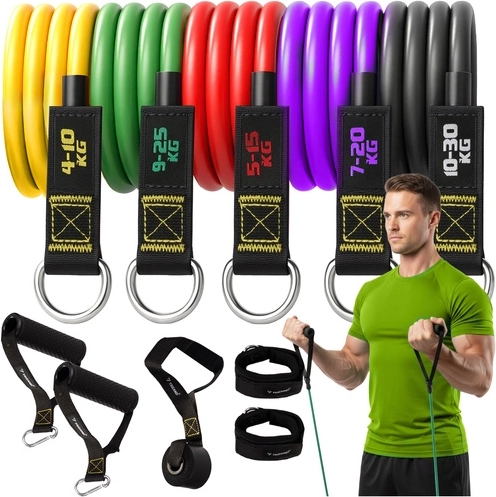 Komplet sæt modstandsbånd fra TRIZAND til effektiv hjemmetræning og træning i fitnesscenter. Indeholder 5 bånd med belastning 4–30 kg, håndtag, ankelstropper, døranker og et etui. Takket være holdbart latex, høj elasticitet og skridsikre håndgreb kan du sikkert træne hele kroppen – ryg, arme, ben, mave og baller.