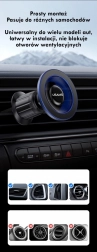 Hook-montering med skruejustering forankrer holderen solidt i risten og forhindrer, at den løsner sig eller falder ud. Installationen er hurtig, værktøjsfri og kompatibel med de fleste biler. Takket være den universelle magnetiske flade holder den pålideligt telefoner i forskellige størrelser, inklusive dem i beskyttende etui.