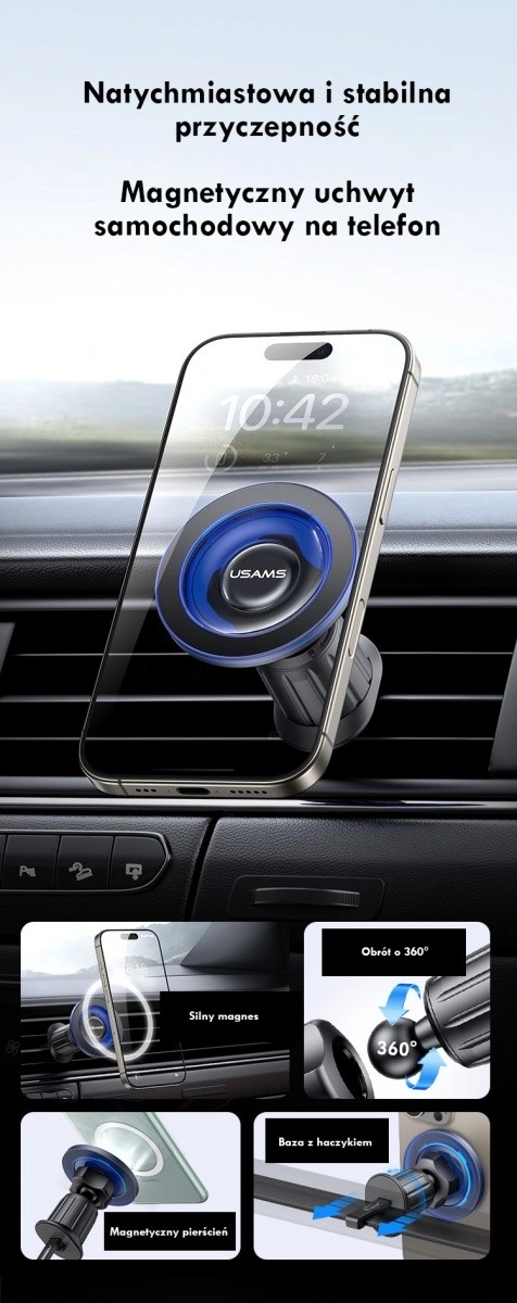 USAMS ZJ081 kombinerer holdbare materialer (akryl og silikone) med gennemtænkt ergonomi. Kraftige magneter med automatisk centreringssystem sikrer stabil fastgørelse af telefonen, mens kugleleddet muliggør jævn justering i både portræt- og landskabstilstand. De kompakte mål generer ikke i kabinen og belaster ikke ventilationsristen.