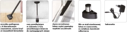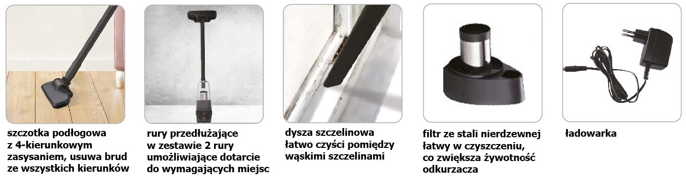 Takket være sugekraften på 6,5 kPa og effekten på 100 W fjerner den pålideligt støv, krummer og snavs fra gulve, tæpper og svært tilgængelige steder. Det elegante sorte design passer ind i enhver indretning, og den lette konstruktion gør det nemt at manøvrere også under møbler.