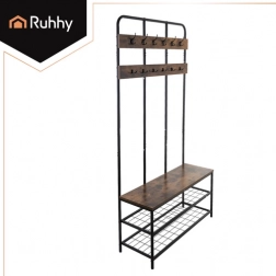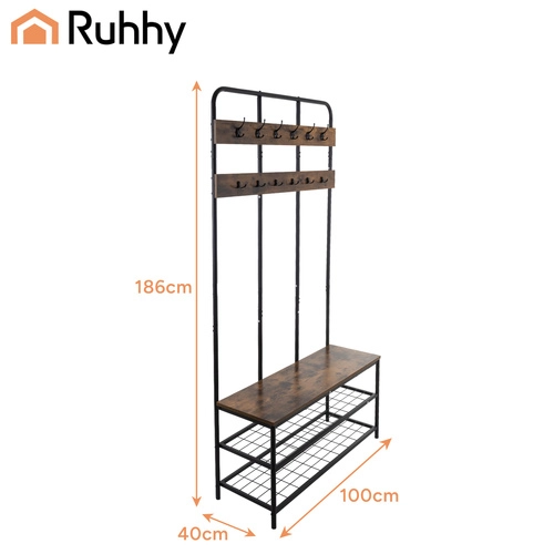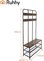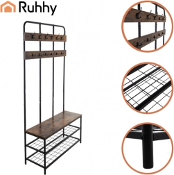 Gør din entré overskuelig og stilfuld. Denne multifunktionelle RUHHY-reol tilbyder smart opbevaring af sko, overtøj og accessories. Den robuste stålramme med pulverlakering og MDF-pladen i varmt trædekor sikrer lang levetid, stabilitet og komfort ved påtagning af sko.