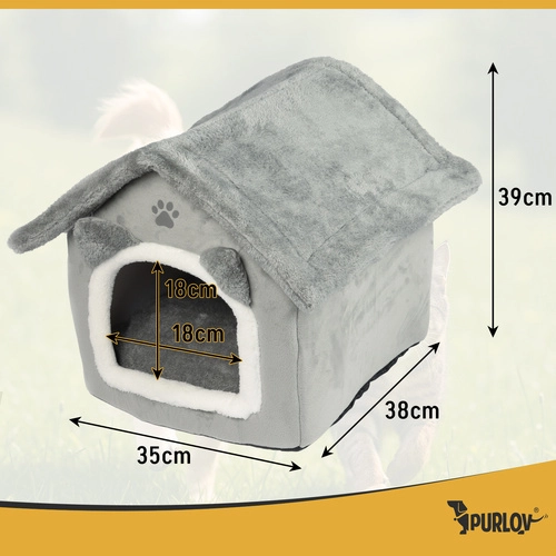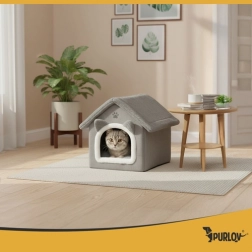 Purlov-huset er både et ideelt gemmested og et behageligt sted at slappe af. Katten kan gemme sig indeni for en rolig lur eller lægge sig til rette ovenpå. Det plysede materiale giver varme og komfort året rundt, mens den lette konstruktion sikrer god åndbarhed i de varmere måneder.