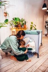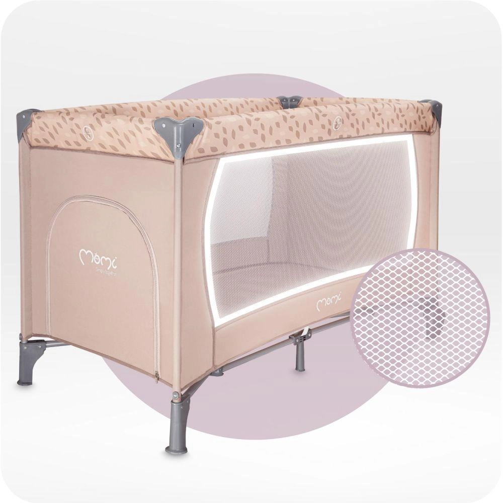 Rejsesengen MoMi Belove er en pålidelig løsning til behagelig søvn og sikker leg for dit barn hvor som helst. Takket være de kompakte mål i sammenklappet tilstand (21 × 23 × 80 cm) og den medfølgende transporttaske kan du nemt tage den med i bilen, til bedsteforældre eller på ferie. Den åndbare netstof sikrer luftcirkulation og overblik over barnet, mens side-lynlåsen giver større børn mulighed for selv at gå ind og ud.