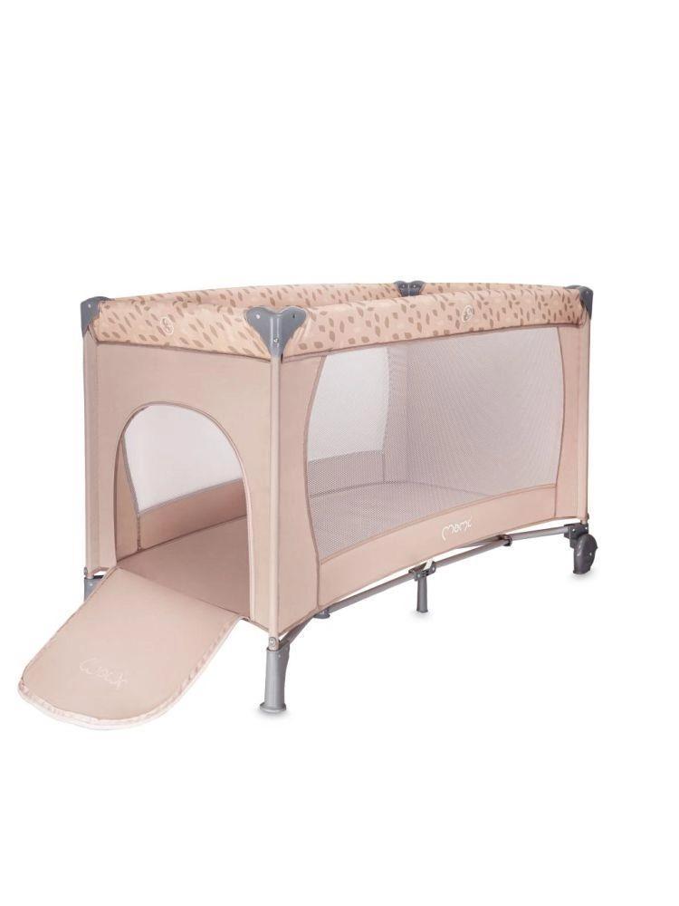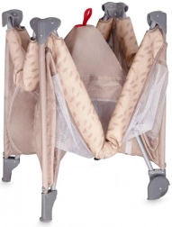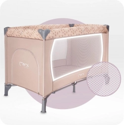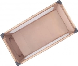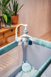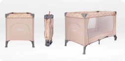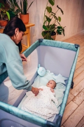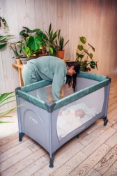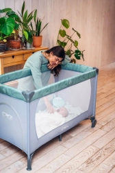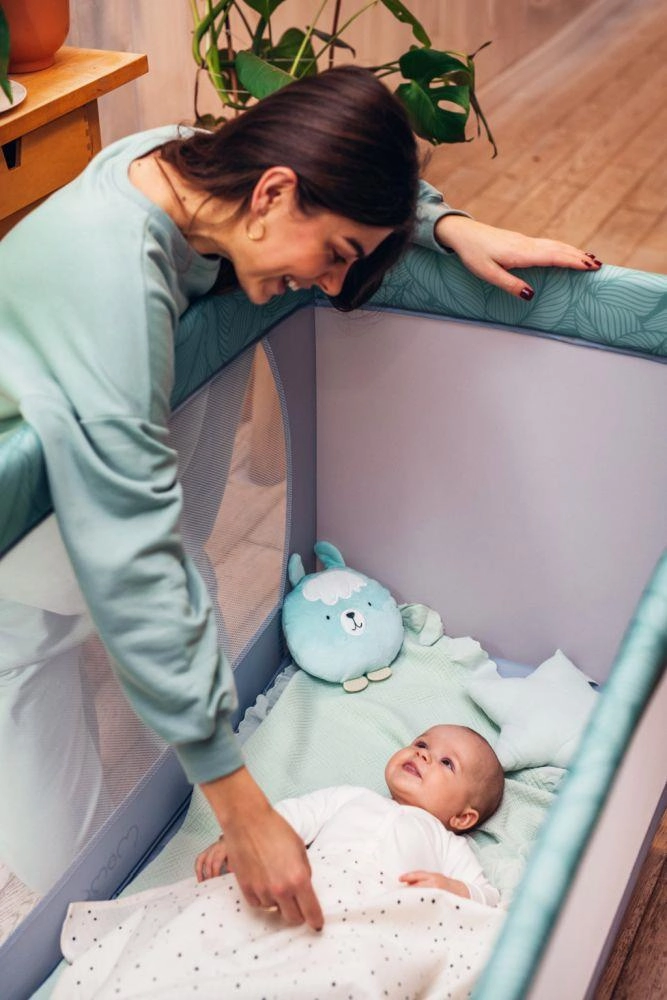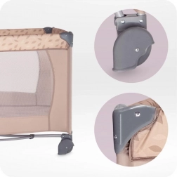 Den stabile konstruktion med plastafdækninger på hjørnerne og et par hjul gør det let at manøvrere rundt i hjemmet. Sengen er udstyret med en madras på 1,2 cm i tykkelse for basal komfort og opfylder europæiske sikkerhedsstandarder – den er testet af det uafhængige laboratorium SGS. Den fungerer glimrende som seng til søvn og som legegård for børn fra fødslen til 36 måneder (maks. 15 kg).