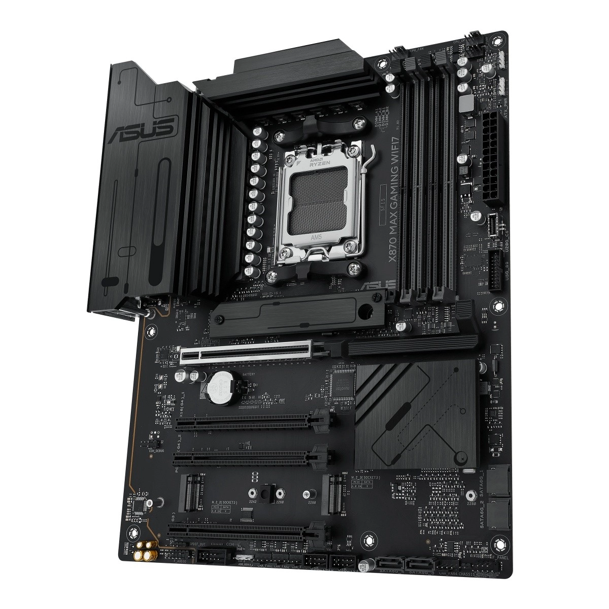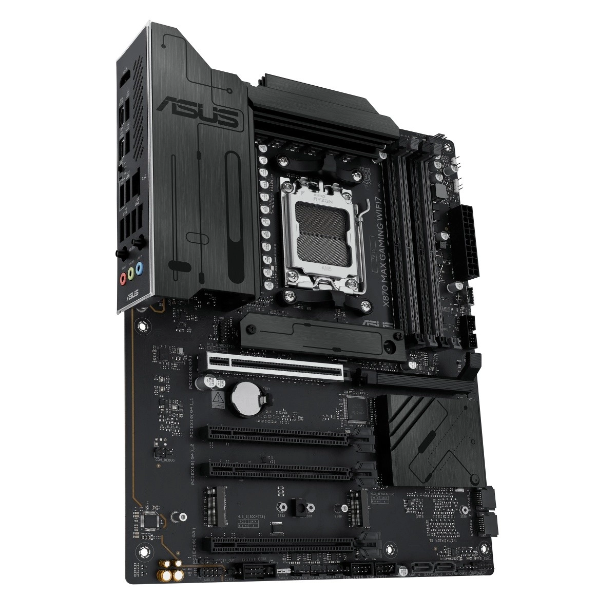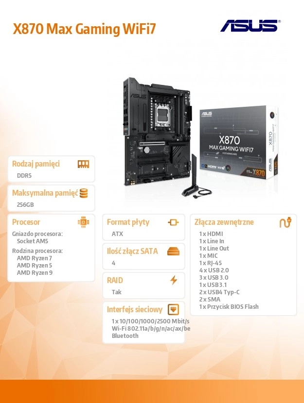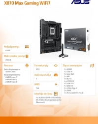 ASUS X870 Max Gaming WiFi 7 er et topklasse gaming-bundkort til AM5-platformen, der låser op for fuld ydeevne på AMD Ryzen 9000-serien. Det kombinerer stabil VRM-strømforsyning, massive køleplader til VRM og M.2 med moderne tilslutning inklusive Wi‑Fi 7 og USB‑C for at levere hastighed, stabilitet og båndbredde til spil, content creation og AI‑workflows.