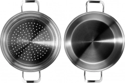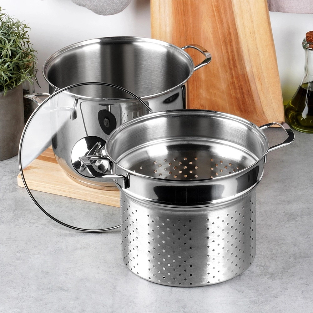 Den perforerede indsats i rustfrit stål gør det muligt at koge og nemt hælde pasta eller grøntsager fra direkte i gryden – et renere arbejdsområde og færre opvaskedele.