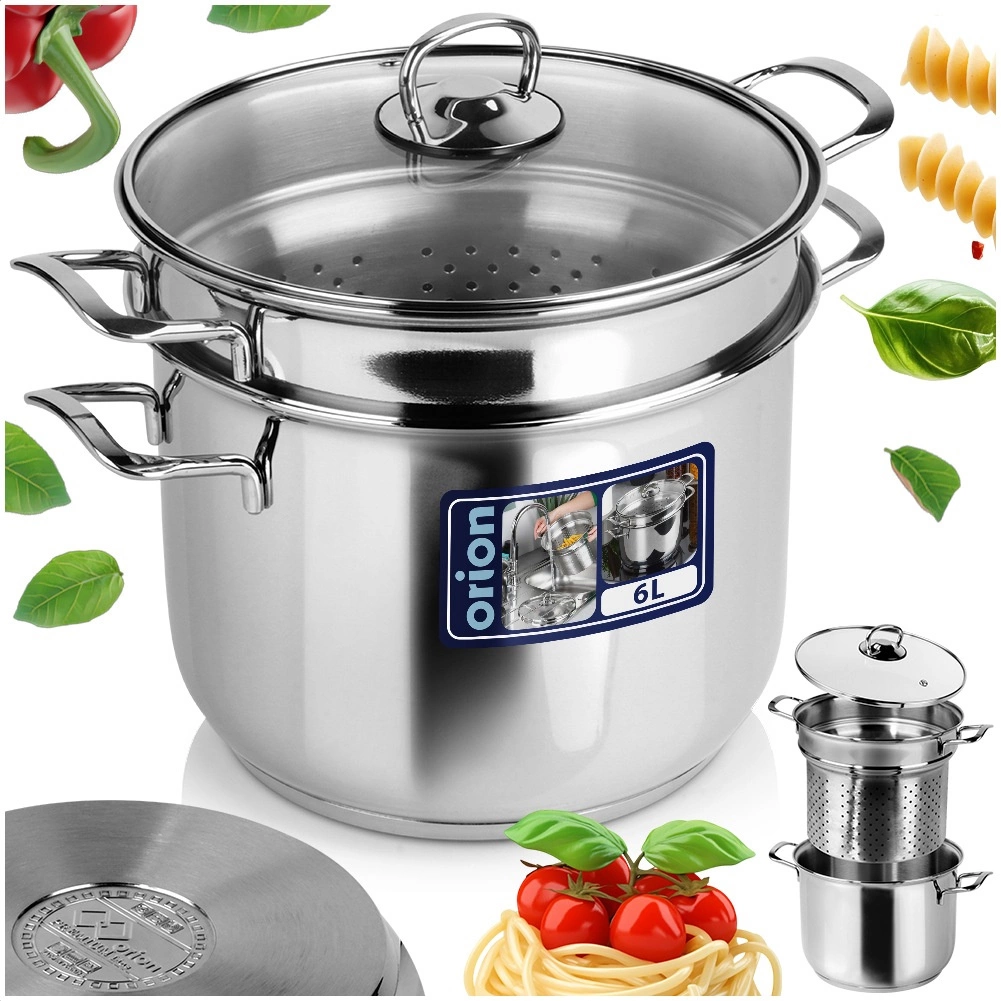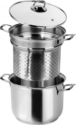 Opdag det alsidige 3-delte ANETT-sæt: rummelig gryde 6 l, perforeret indsats til kogning og afdrypning samt glaslåg med dampudgang. Den robuste konstruktion af poleret rustfrit stål er holdbar, let at rengøre og ser fantastisk ud i det moderne køkken. Takket være indsatsen kan du koge og hælde pasta eller grøntsager fra uden brug af et ekstra dørslag.