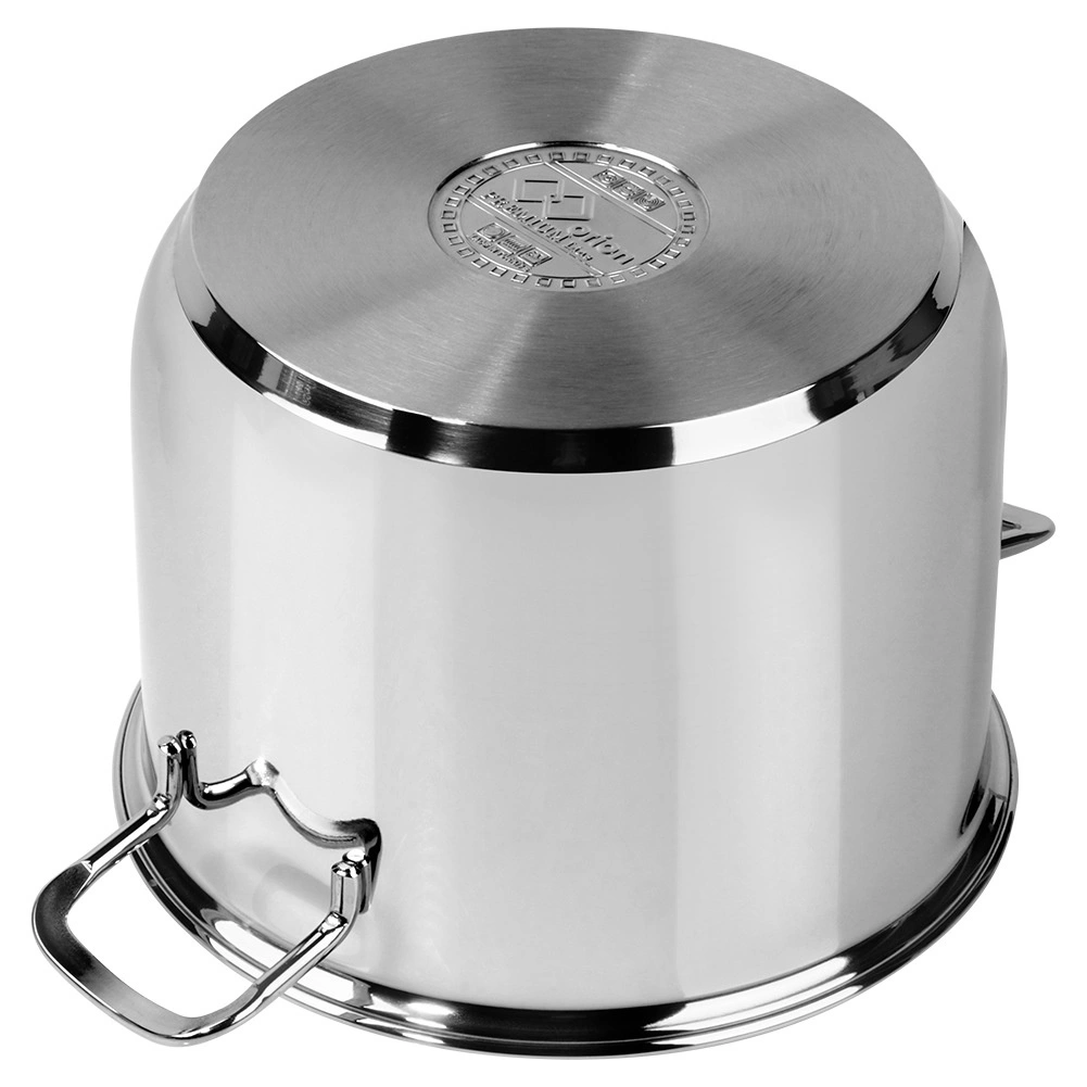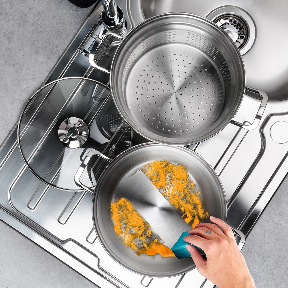 Poleret rustfrit stål er hygiejnisk og korrosionsbestandigt. Sættet kan vaskes i opvaskemaskine, og hankene sikrer sikker håndtering.