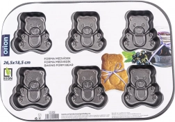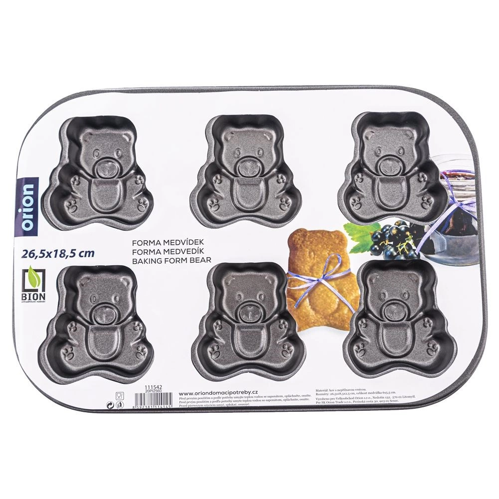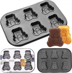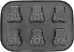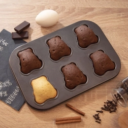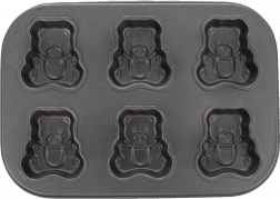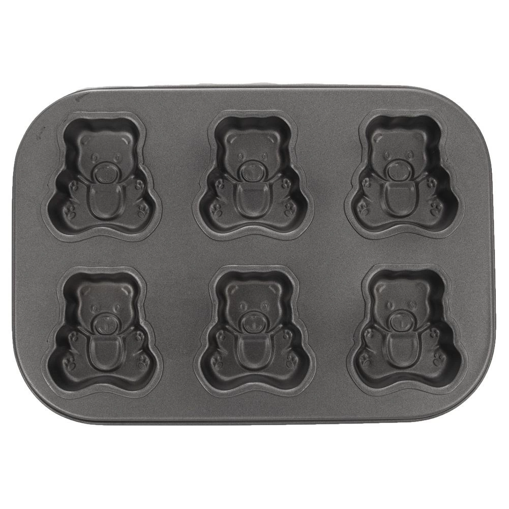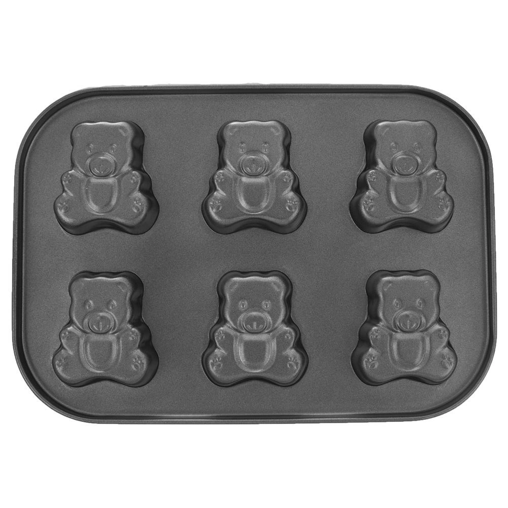 Denne kvalitetsform måler 26,5 × 18,5 × 2,5 cm og laver 6 detaljerede bjørne på ca. 6 × 5,5 cm. Takket være den nonstick-belagte overflade hænger dejen ikke fast, og de færdige stykker vendes nemt ud uden at miste formen. Perfekt til populære bagte bjørne med sødt fyld eller enkel sandkagedej.