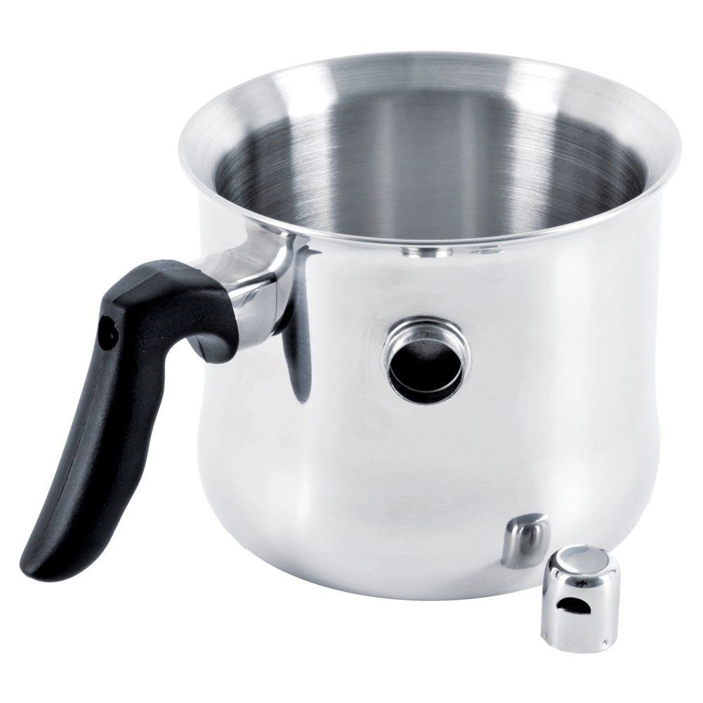 Denne mælkekande med dobbeltvæg og vandkappe er et fremragende valg til skånsom opvarmning af mælk, chokolade, budding eller fine saucer. Skru blot fløjteventilen af, hæld vand i kappen og kog – når mælken er klar, giver ventilen lyd. Det ergonomiske sorte håndtag ligger godt i hånden og sikrer sikker håndtering.