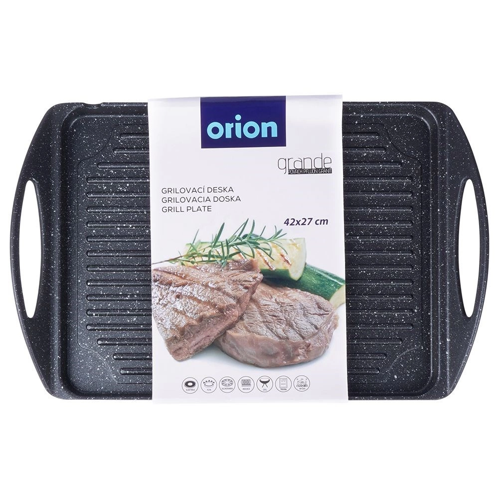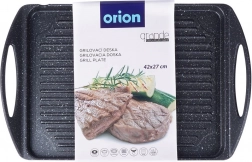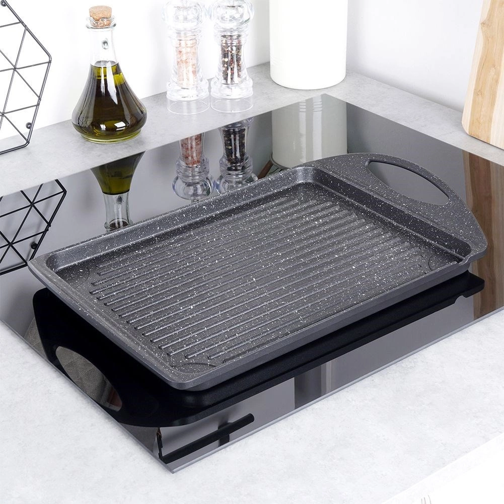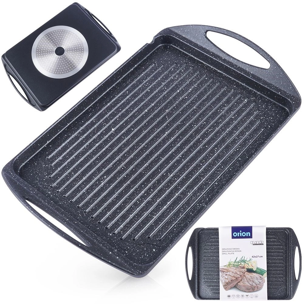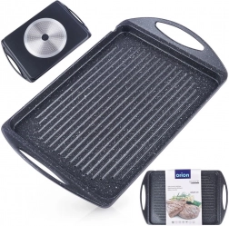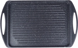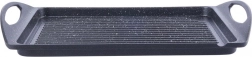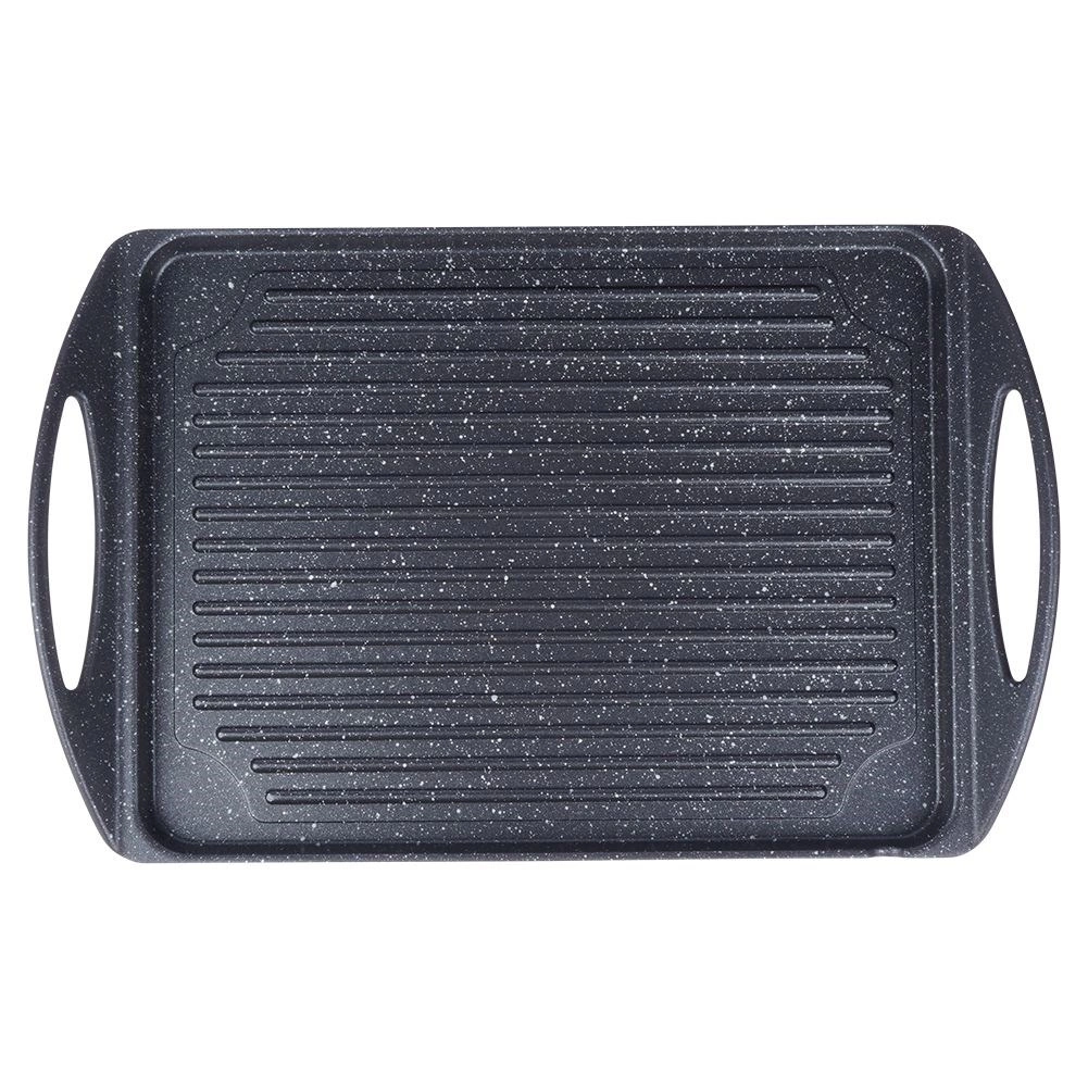 Praktisk grillplade i størrelsen 42 × 27 cm med robust aluminiums-krop og granit non-stick overfladebehandling PFLUON GRANIT for jævn varmefordeling. Den rillet overflade giver de klassiske grillmærker og leder fedt væk, og de integrerede håndtag gør håndteringen nemmere. Velegnet til gas-, el-, glaskeramiske og induktionskomfurer, til ovn og havegrill. Uden PFOA og PTFE, nem at rengøre og tåler opvaskemaskine.