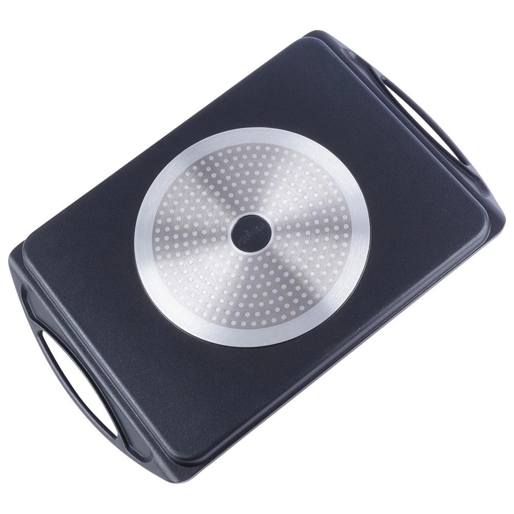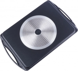 Pladen er kompatibel med de fleste varmekilder, inklusive induktion, og kan bruges i ovn eller på grill. Integrerede sidehåndtag sikrer sikker flytning. De indvendige mål 34 × 26 × 2 cm giver rigelig plads til kød, grøntsager, fisk og ost.