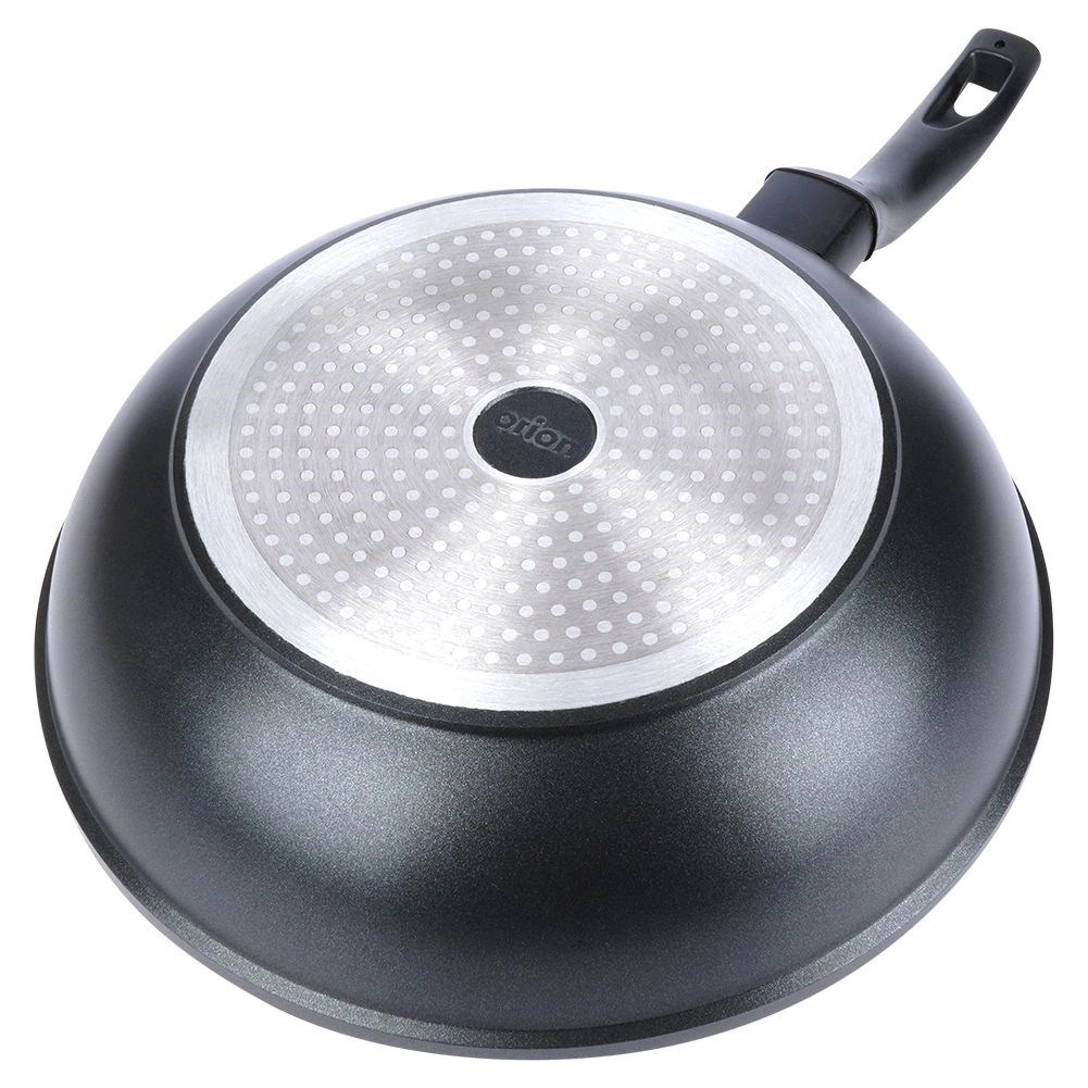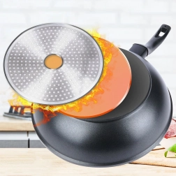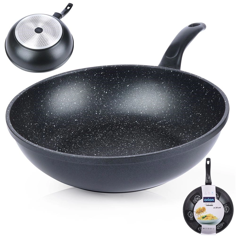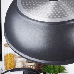 Wok GRANDE 30 cm kombinerer et massivt aluminiumskorpus for hurtig og jævn varmefordeling med en slidstærk slip-let granitbelægning, som gør både madlavning og rengøring lettere. Den er ideel til sautering, stegning og simring af kød og grøntsager og egner sig perfekt til retter inspireret af den asiatiske køkken, inklusive hurtige nudler og stir-fry.