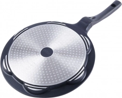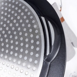 Aluminiumskroppen med fremragende varmeledning fordeler varmen over hele pandens overflade, hvilket betyder besparelse af tid og energi. Pandens kompatibel med gas, el, glaskeramik og induktion. Det ergonomiske håndtag af robust plast bliver ikke varmt for sikker håndtering.