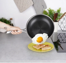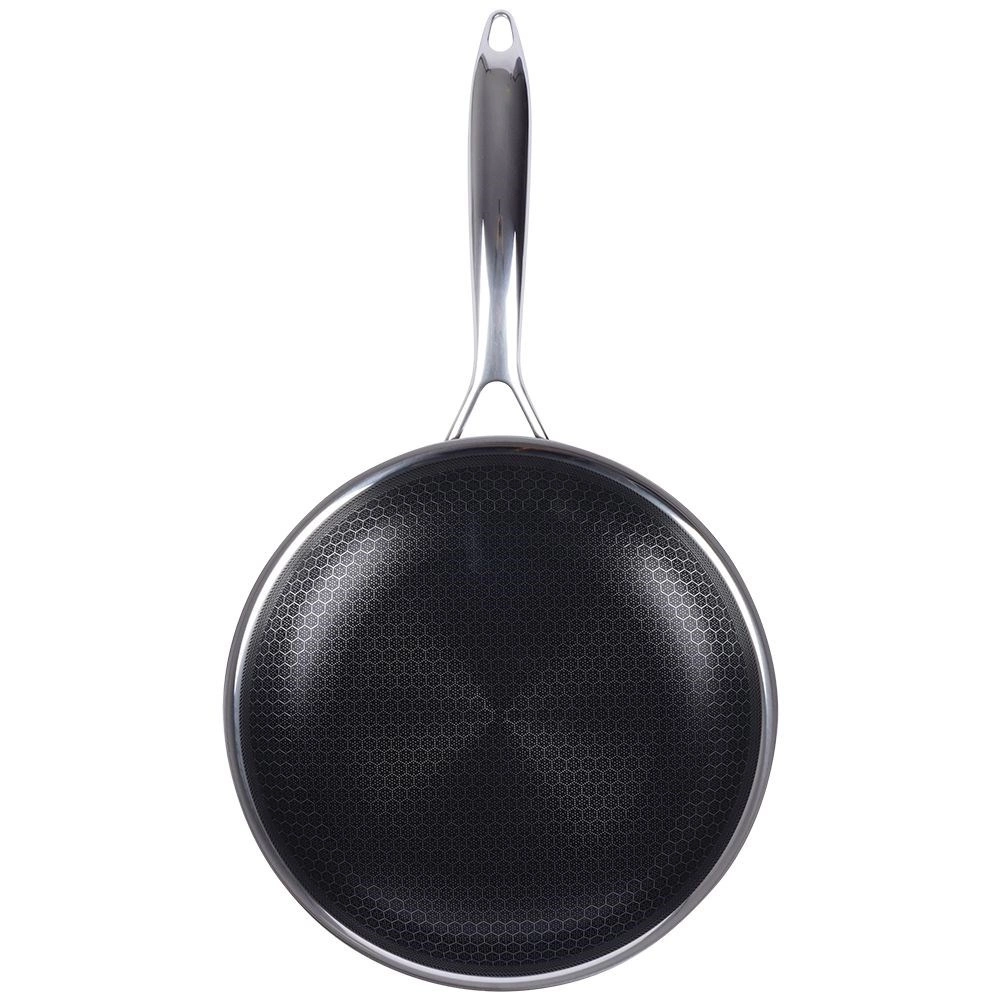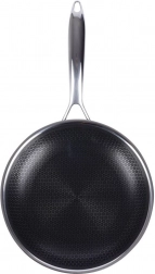 Den særlige hexagonale tekstur sikrer fremragende slip-let egenskaber og lang levetid. Du kan trygt bruge køkkenredskaber af metal på panden.