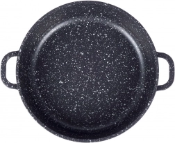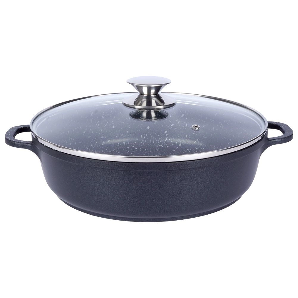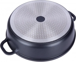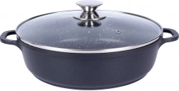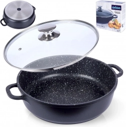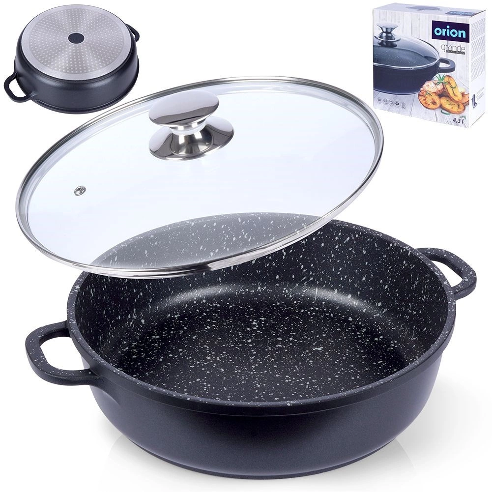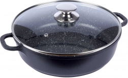 Praktisk granitpande med en diameter på 28 cm, volumen 4,3 l og glaslåg tilbyder nonstick-overflade, hurtig og jævn opvarmning og alsidig anvendelse på alle typer komfurer, inklusive induktion. Den robuste granitbelægning PFLUON uden PFOA og PTFE muliggør madlavning med mindre fedt og nem rengøring.