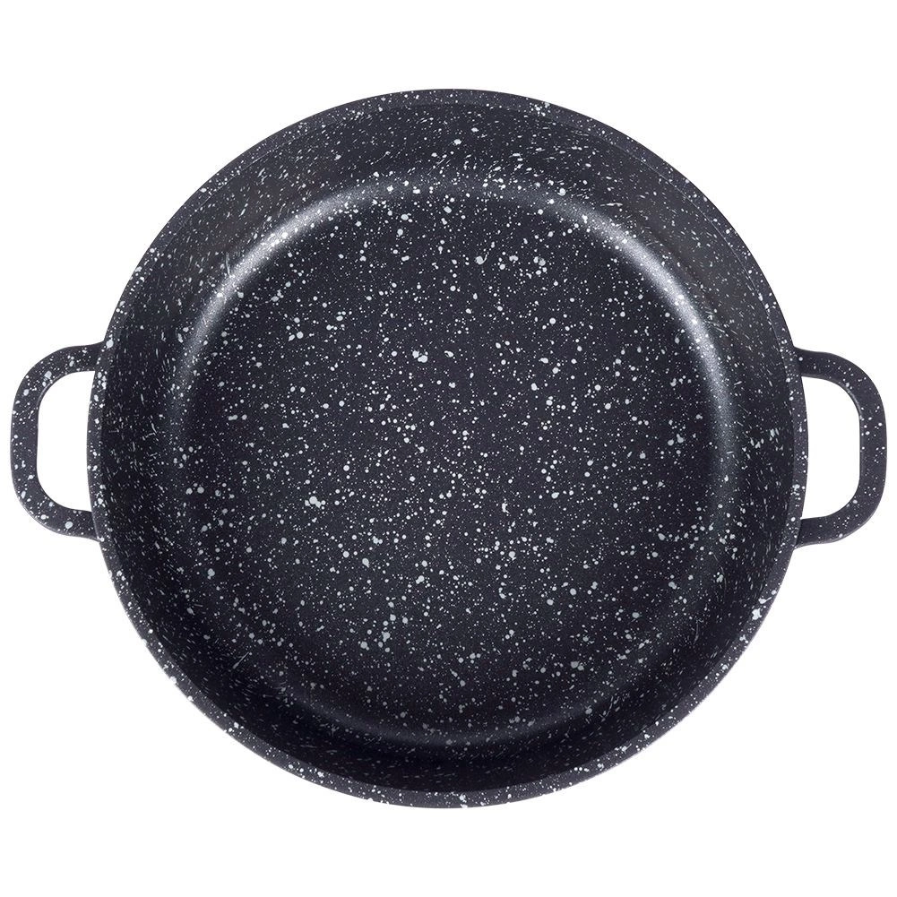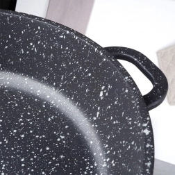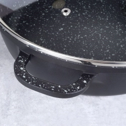 Den robuste aluminiumpande i elegant sort med stenlook har indvendigt en højkvalitets granit nonstick-overflade PFLUON, som tåler høje temperaturer og ridser. Glaslåget med rustfri stålkant og dampventil gør det let at kontrollere tilberedningen og bevarer fugt for saftige resultater.