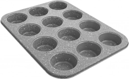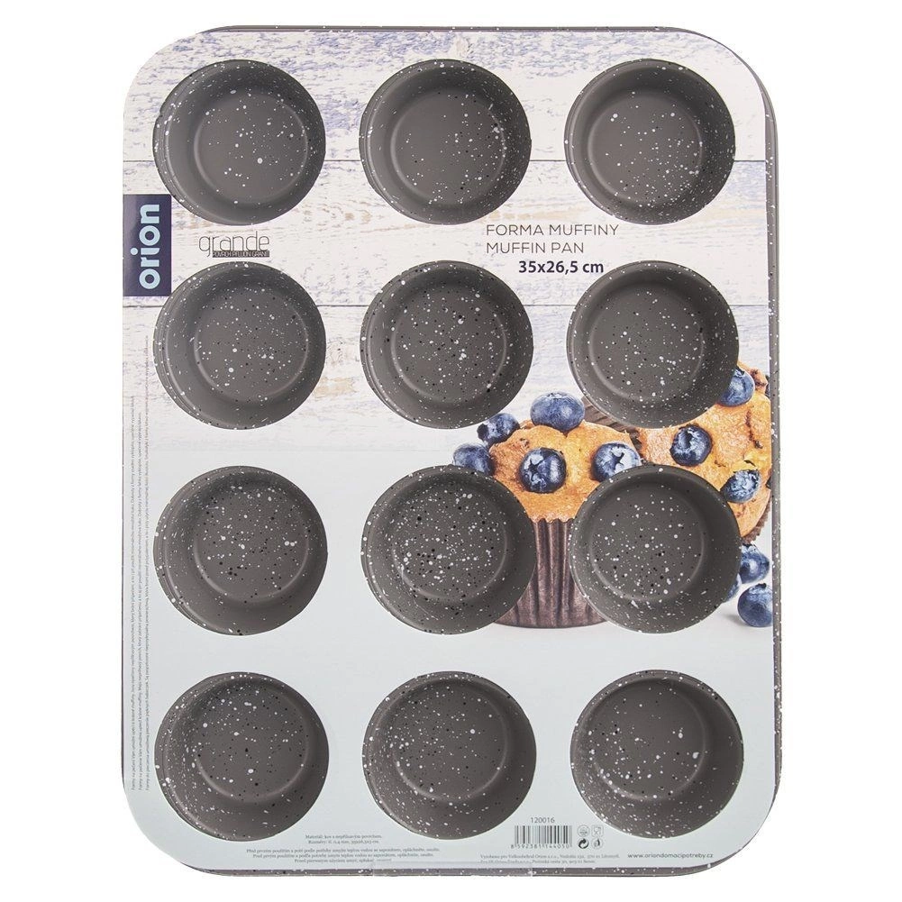 Praktisk granitform til muffins til bagning af op til 12 styk ad gangen. Takket være den non-stick overfladebehandling af kulstofstål brænder dejen ikke på, og bagningen er let selv med minimalt fedt. Formen er varmeresistent op til 230 °C, egnet til gas- og elovne og kan tåle opvaskemaskine – ideel til hjemmelavede muffins, cupcakes, mini desserter og småkager.