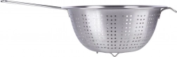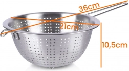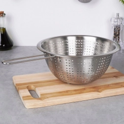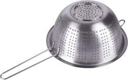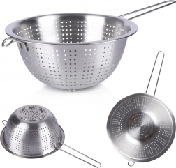 Den praktiske skåleformede si giver komfortabel og sikker afvanding. Det lange håndtag sikrer et fast greb, hjælpekrogen/øret gør det muligt at hvile stabilt på kanten af beholderen, og benene holder sien sikkert på plads. Den tætte perforering sørger for hurtig afdrypning.