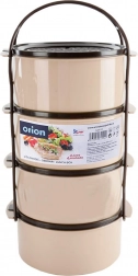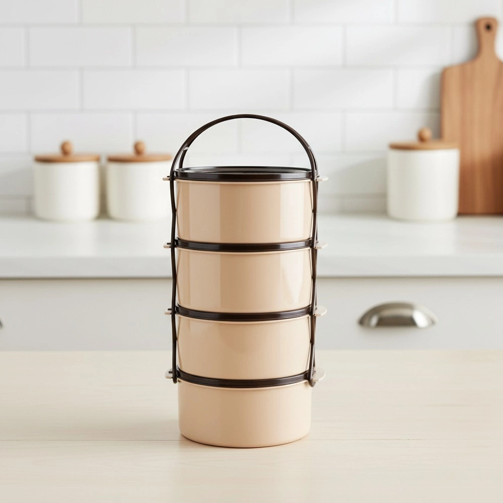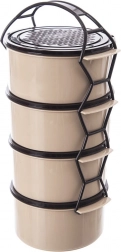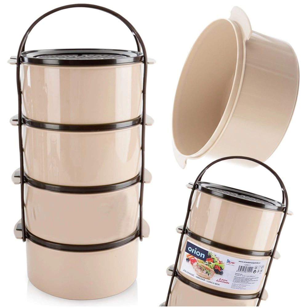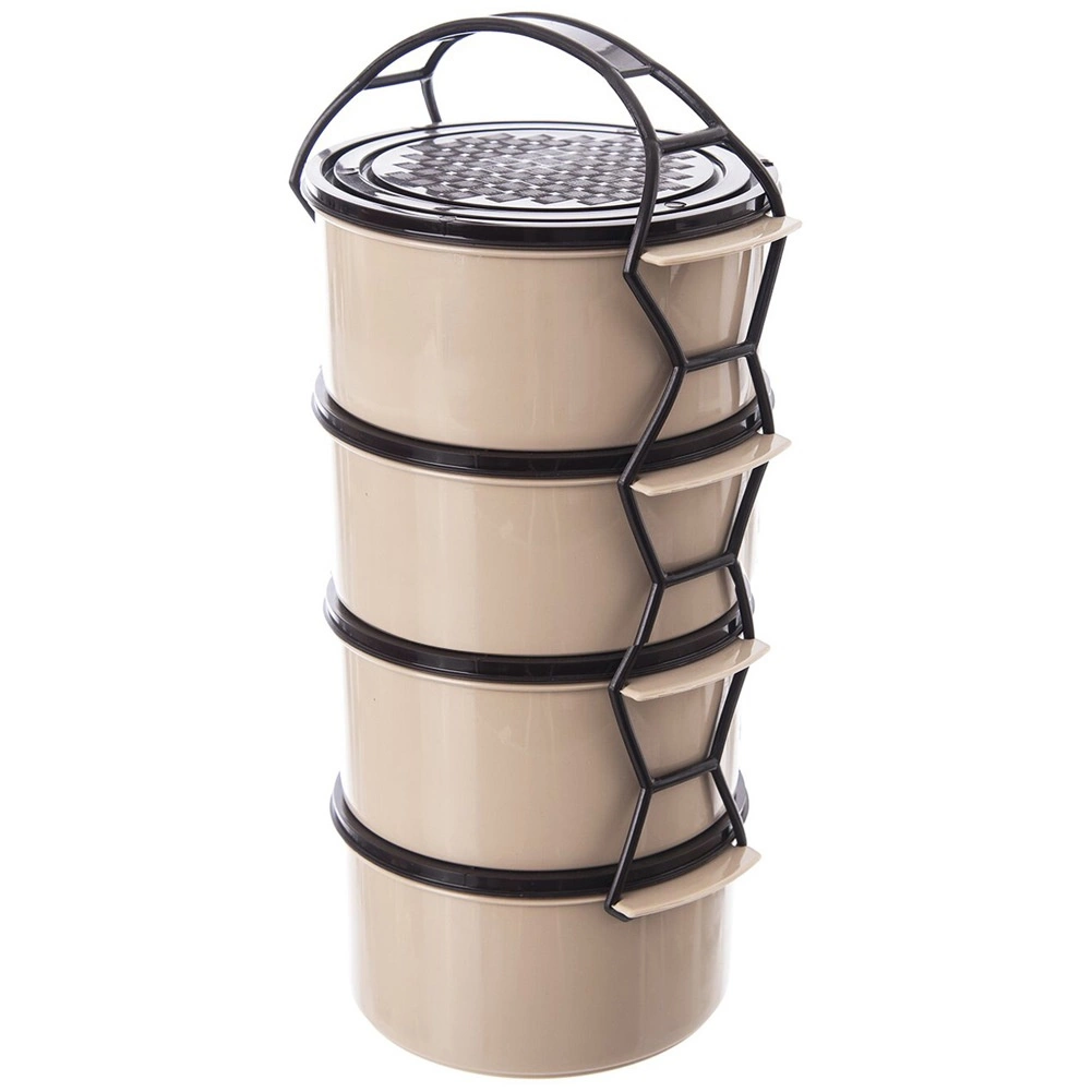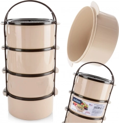 Praktisk fireetagers madtiffin med en kapacitet på 4×1,5 l til overskuelig adskillelse af retter. Har stabelbare beholdere med låg, en solid bæreramme med håndtag og et holdbart design i beige-brun farve. Velegnet til opvaskemaskine, køleskab, fryser og til mikrobølgeovn uden låg.