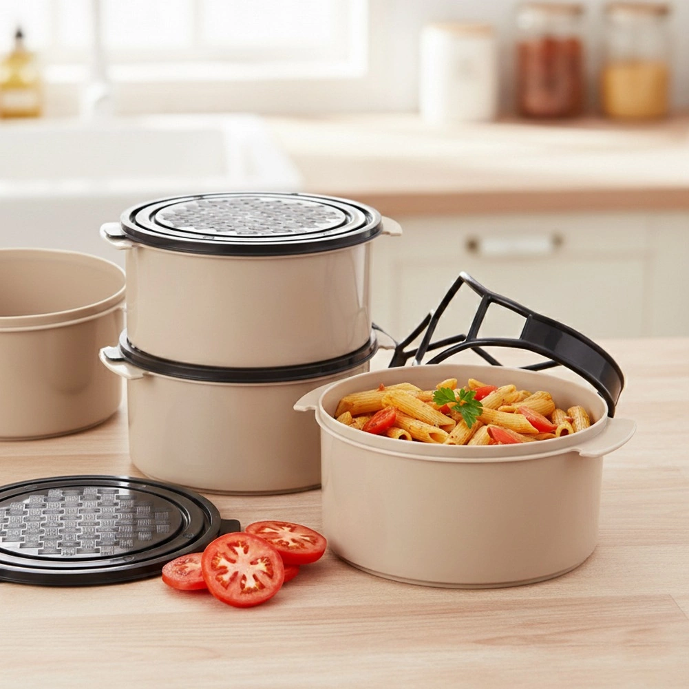 Nyd bekvem transport af frokost og aftensmad med en tiffin med fire separate beholdere på 1,5 l. Hver beholder har sit eget låg, og det hele holdes samlet af en robust ramme med håndtag, så du sikkert kan transportere forskellige retter hver for sig. Ideel til rejser, udflugter, camping og til daglig madtransport til arbejde.