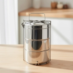Denne termo-madkasse kombinerer holdbart rustfrit stål med en funktionel inddeling i tre separate beholdere, som kan spændes sikkert sammen til en stabil enhed. Hver beholder har en kapacitet på 900 ml, så du nemt kan adskille suppe, hovedret og tilbehør. Takket være dobbeltvæg med vakuumisolation holder du maden ved den ønskede temperatur i længere tid.