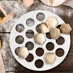 Formen fremskynder udstikning og formning, holder ensartet størrelse og er velegnet til både søde og salte fyld. Brug den ikke kun til pelmeni, ravioli eller mini-pirogger, men også til småkager og småkonditori med rund form. Materialet er sikkert til fødevarekontakt og opfylder europæiske standarder.