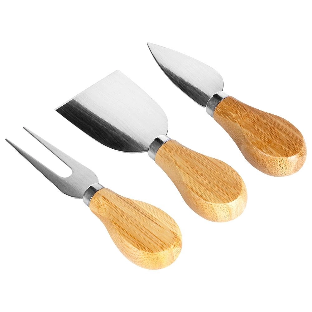 Gaffel, mejselkniv og spids kniv med ergonomiske træhåndtag dækker skæring, udskæring og servering.