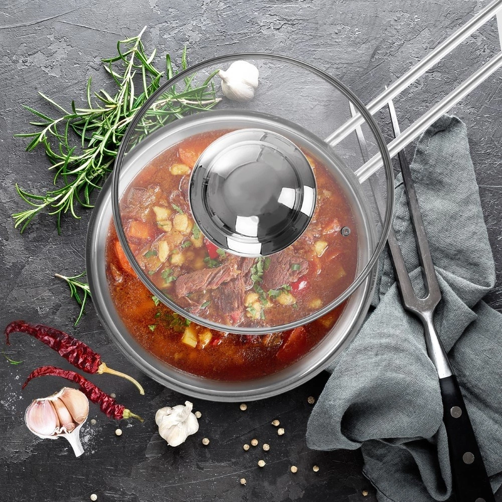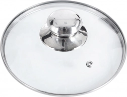 Den integrerede dampskudsventil leder overskydende damp væk og minimerer overkog. Takket være den let hvælvede form cirkulerer den varme luft bedre, hvilket fremskynder tilberedningen. Den skridsikre stålkant hjælper med en pålidelig pasform på kogegrejet og giver komfortabel brug.