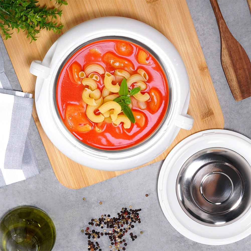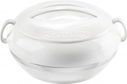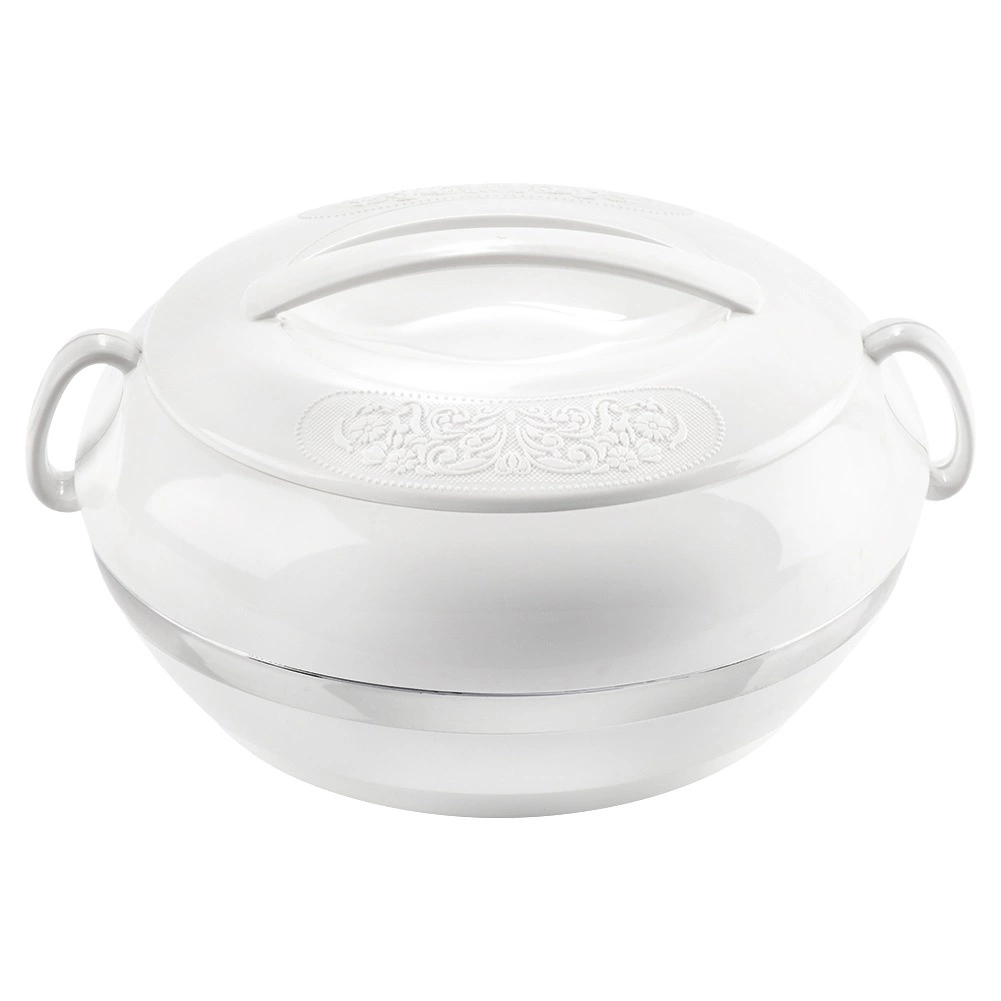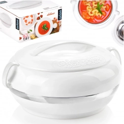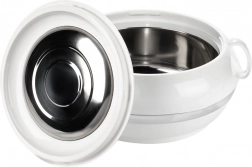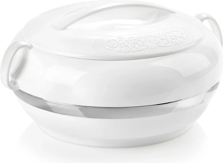 Bevar madens temperatur uden besværlig opvarmning. Denne isolerede serveringsskål er perfekt til familiemiddage, grill og havefester. Den indvendige del i rustfrit stål hjælper med at holde varmen i op til 2 timer, og om sommeren beskytter den is eller kolde desserter mod at smelte for hurtigt. Det elegante låg med dekor og det rene hvide design passer ind i ethvert køkken.