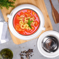 Dobbeltvægget konstruktion med indsats i rustfrit stål holder maden varm eller kold længere – ideel til servering af både supper og desserter.