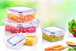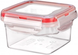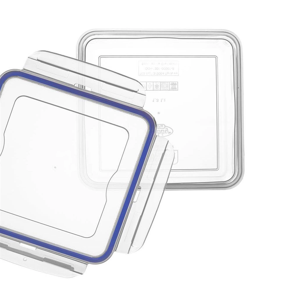 Praktisk kvadratisk beholder (10 × 10 × 6 cm) i høj kvalitet, transparent plast holder din mad frisk længere takket være silikonepakning og fire låseklips. Perfekt til daglig brug hjemme, på arbejdet og på farten – uden bekymring for spild.