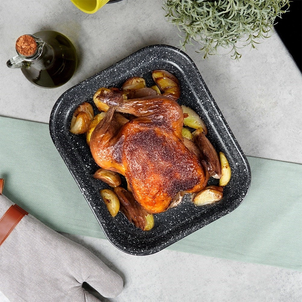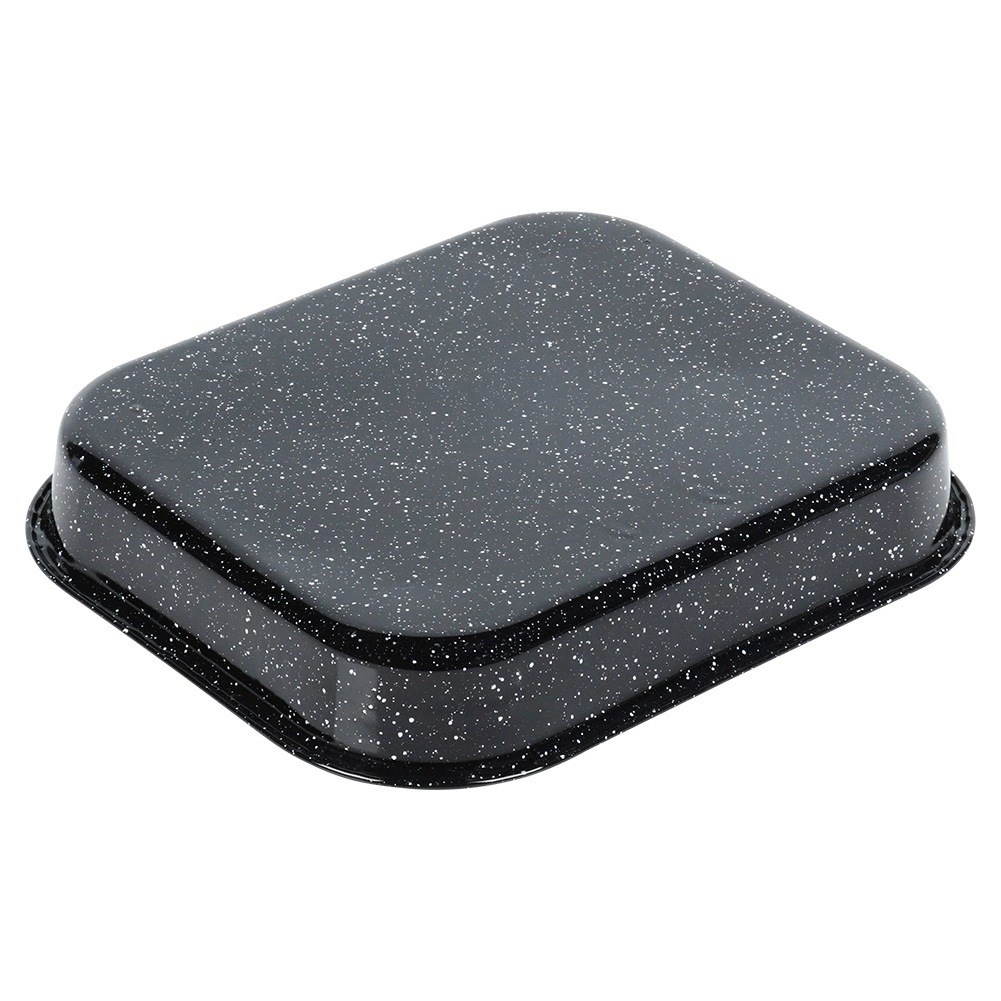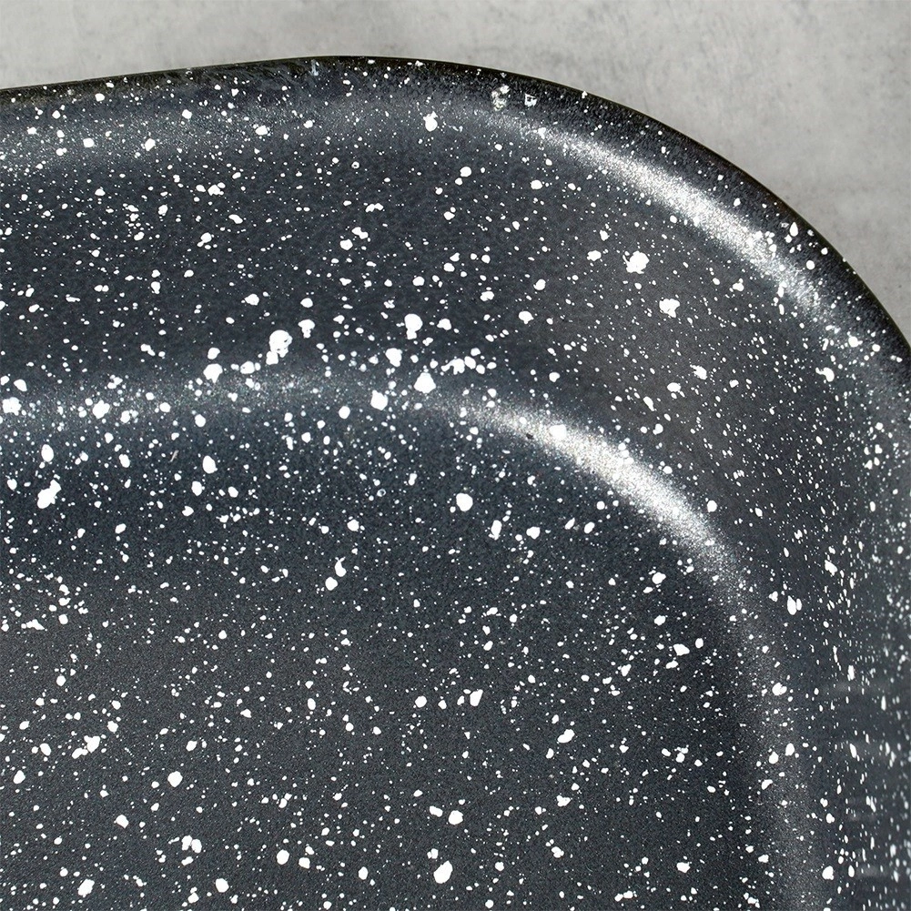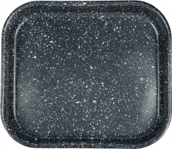 Den robuste stålbradepande med emaljeret korpus og en granit, særdeles holdbar nonstick-overflade sikrer jævn tilberedning og nem udløsning af retterne. De indvendige mål 27 × 23 × 4 cm er perfekte til stegning af kylling, grøntsager, kager og hjemmelavet pizza.