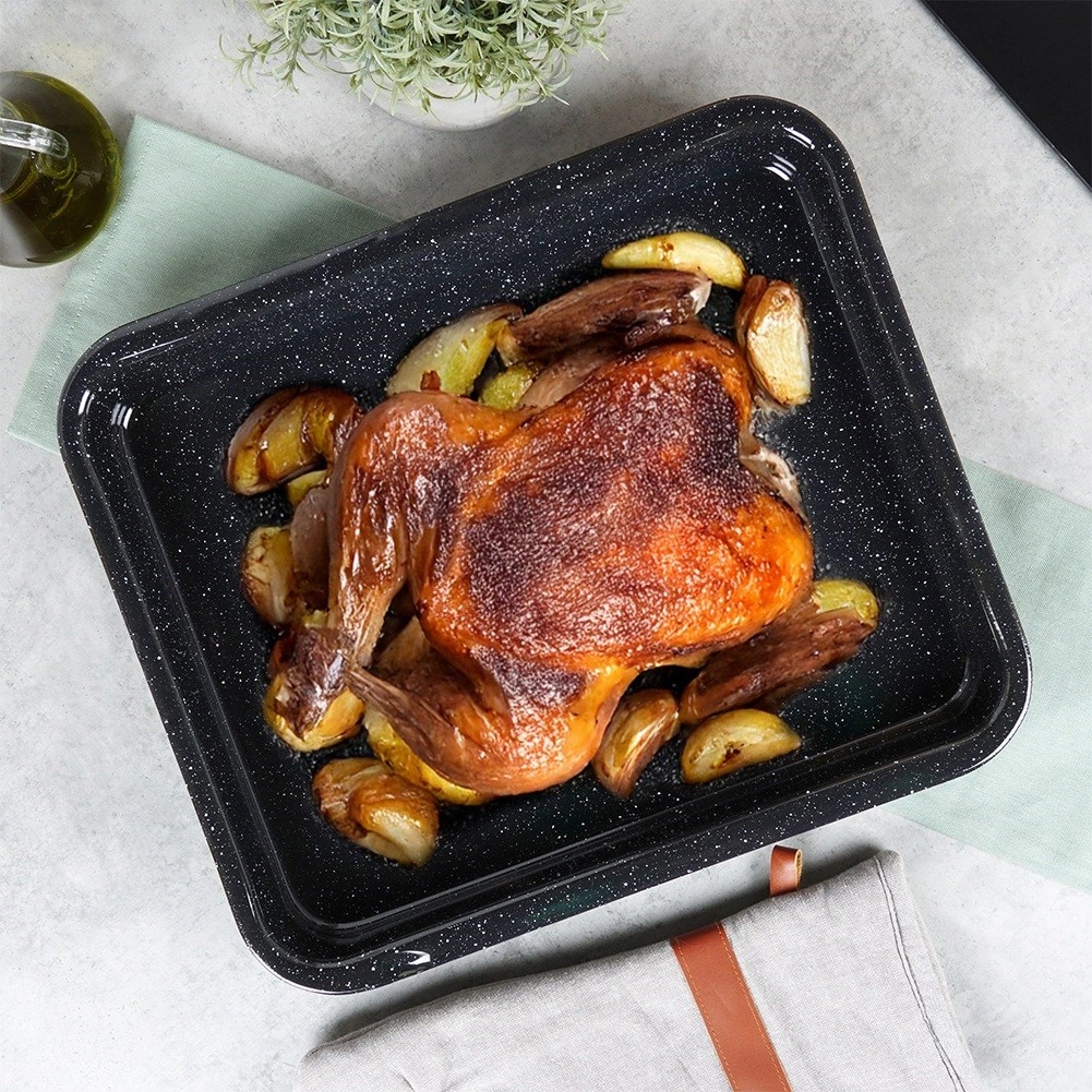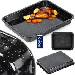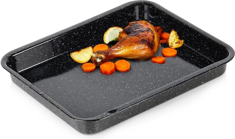 Praktisk rektangulær bradepande af kvalitets emaljeret stål med volumen 4 liter og mål 39,5 × 33,5 × 4,5 cm er ideel til stegning af kød, grøntsager og desserter. Den robuste emaljerede overflade er nem at rengøre, maden brænder ikke så let på, og bradepanden er velegnet til gas- og elovne samt til opvaskemaskine.