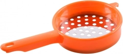 Det lange håndtag giver et behageligt greb, og det lille støtteøje gør det muligt at placere den sikkert på en skål eller gryde. Et praktisk ophængsøje for enden af håndtaget gør det let at hænge den på en køkkenliste. Produktet leveres i tilfældige farver (hvid, gul, orange). Den er desuden let at rengøre – tåler opvaskemaskine.