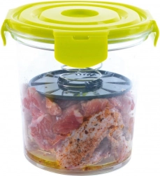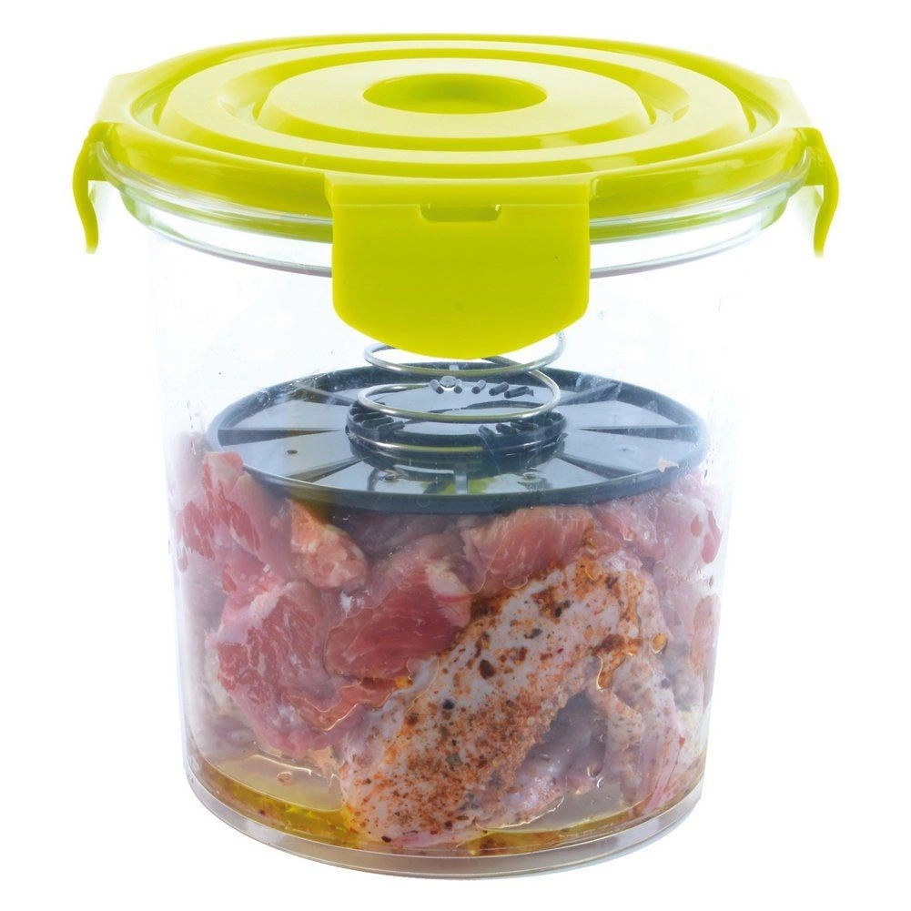 Den robuste, gennemsigtige beholder giver fuldt overblik over indholdet, og takket være fjederpladen holdes råvarerne jævnt presset under overfladen. Det forbedrer smagsgennemtrængning, mindsker behovet for store mængder olie eller lage og hjælper med at opnå intens smag.